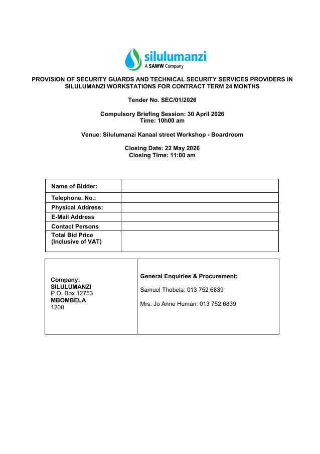 Only registered Security Service Providers as contemplated in terms of Section 21 of the Private Security Industry Regulation Act (PSIRA), 2001 (Act No. 56 of 2001) and companies that have Five (05) years of working experience and must have offices within Silulumanzi Concession Boundaries (KaNyamazane, Nelspruit or Matsulu) shall be eligible to submit tenders. Bid documents will be readily available on the Silulumanzi website: https://www.silulumanzi.com/ on the Procurement’s Folder: Tenders and Notices.