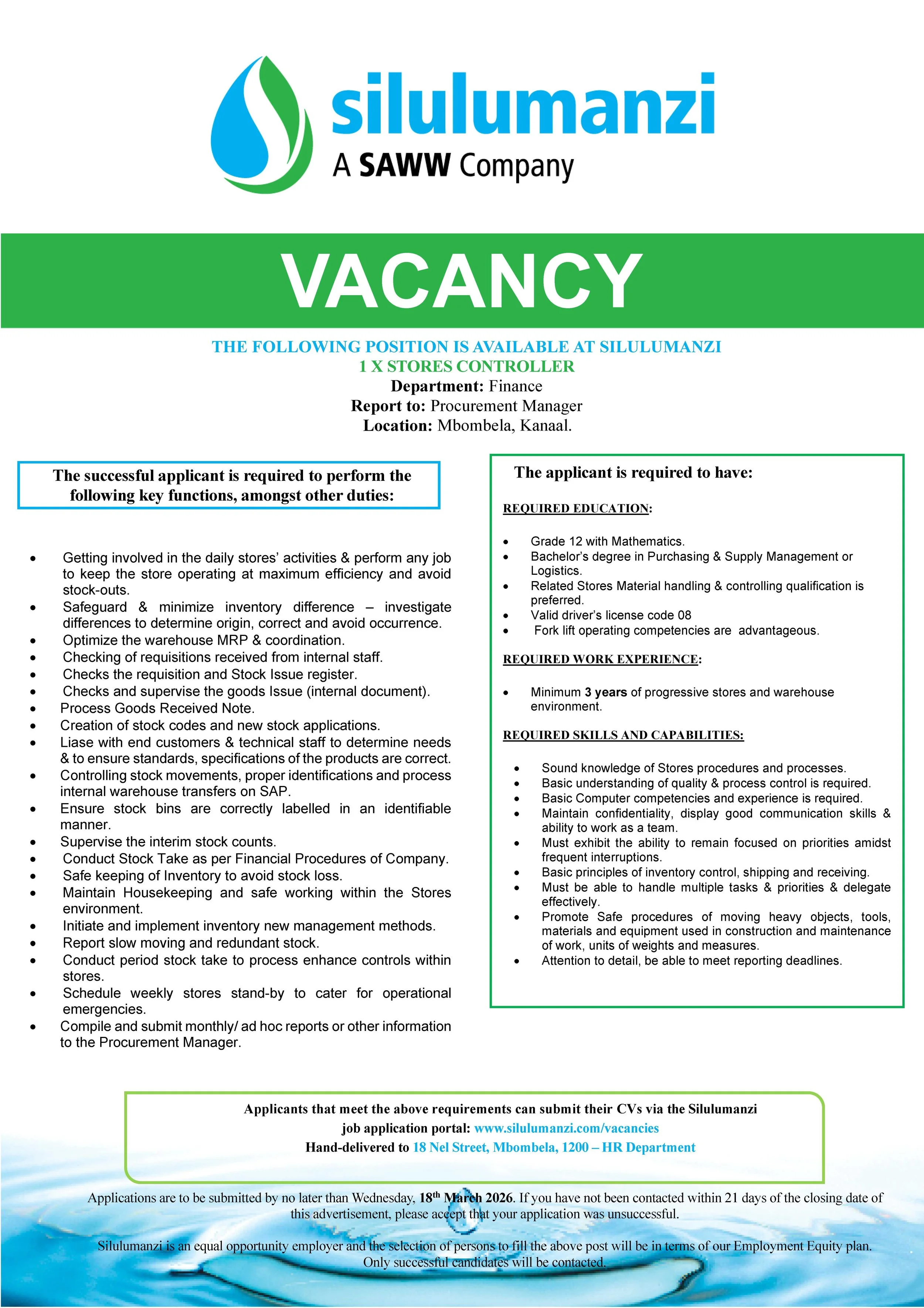 Proficient in English, Afrikaans and SiSwati an added advantage.