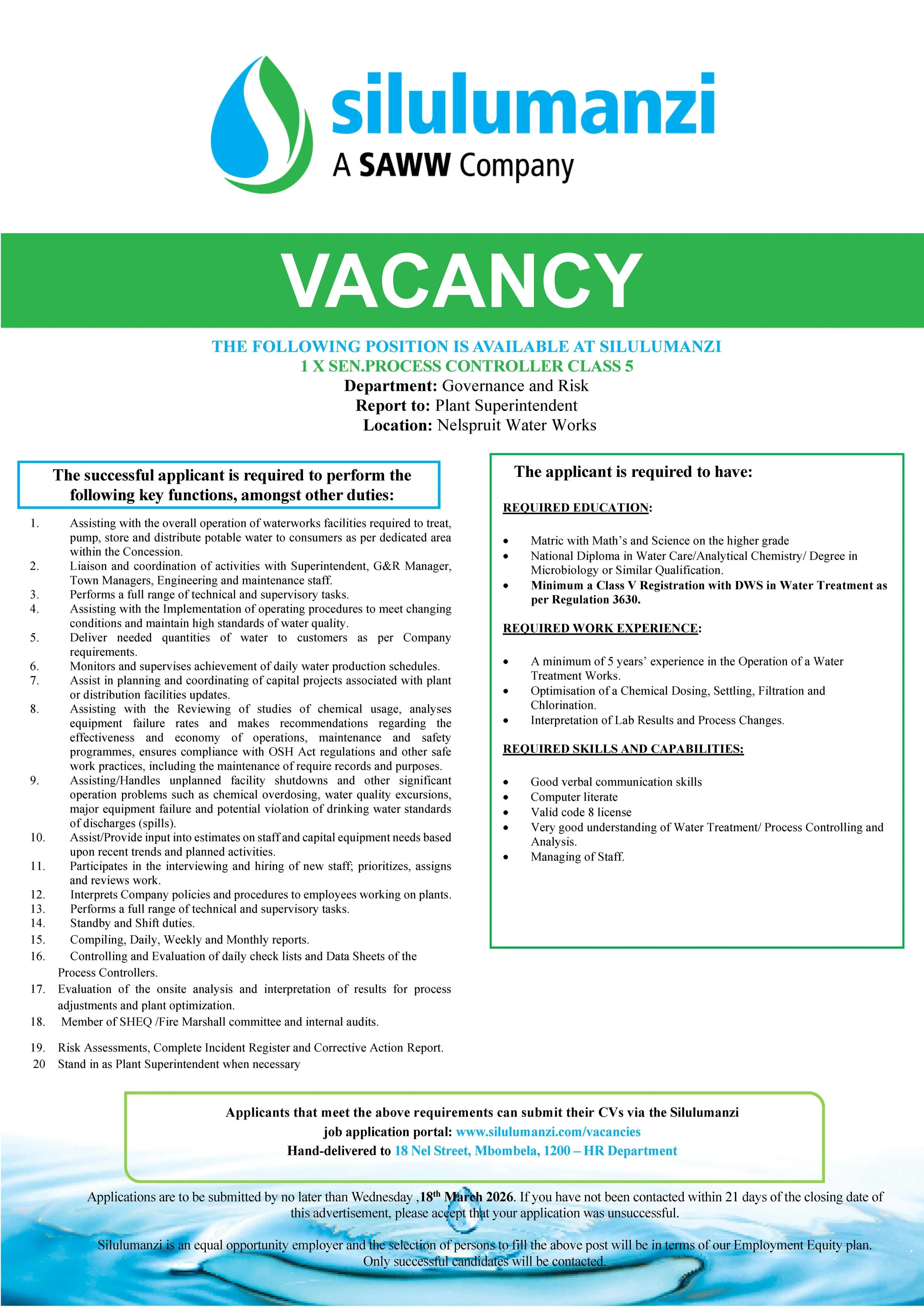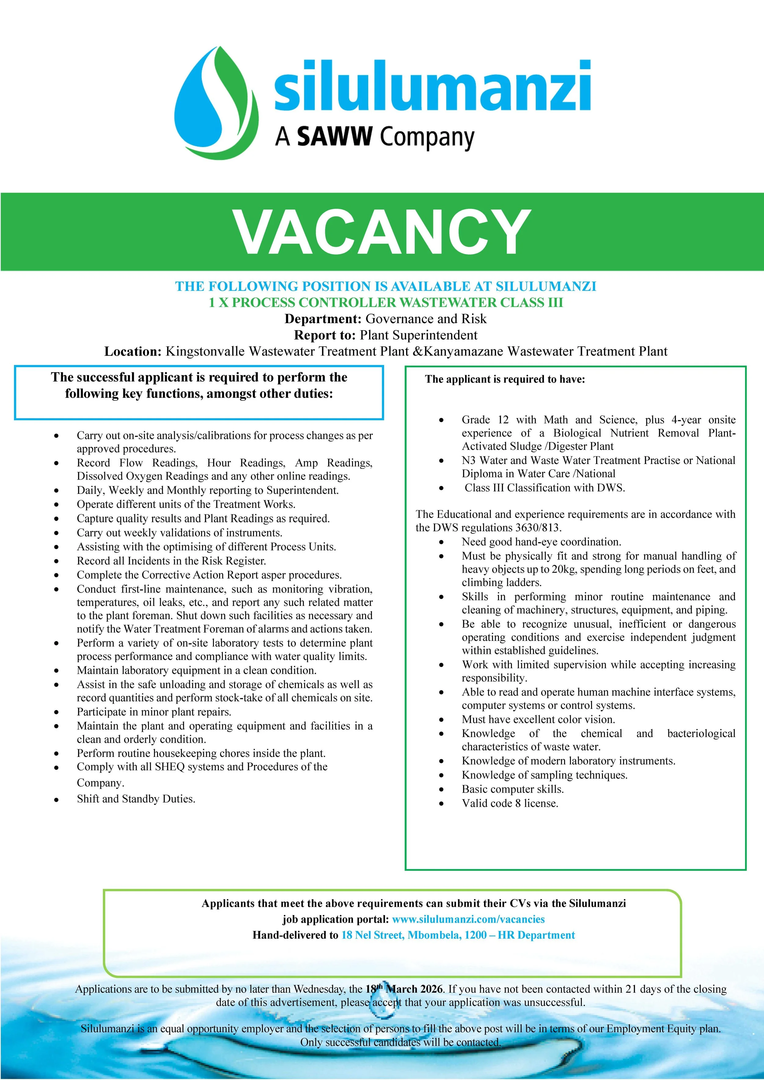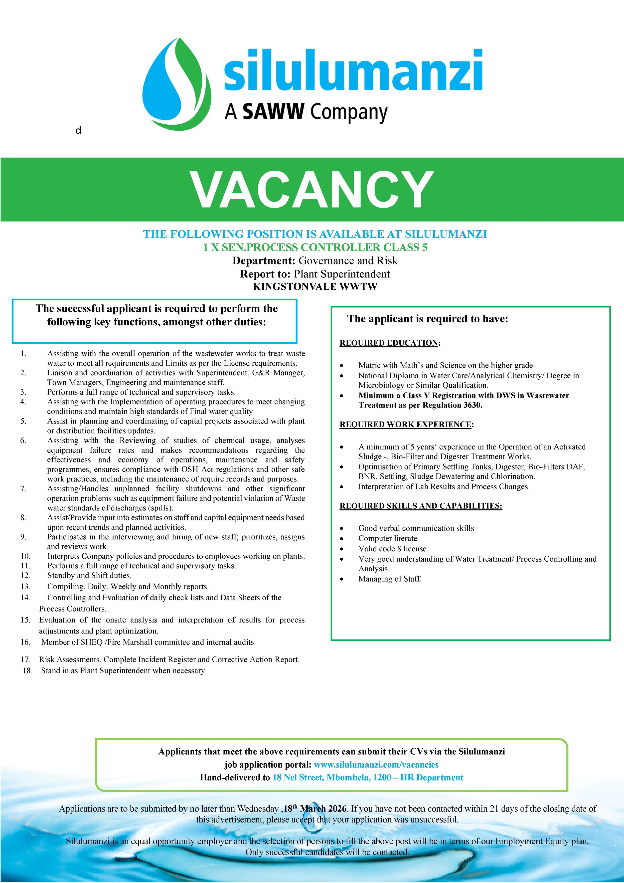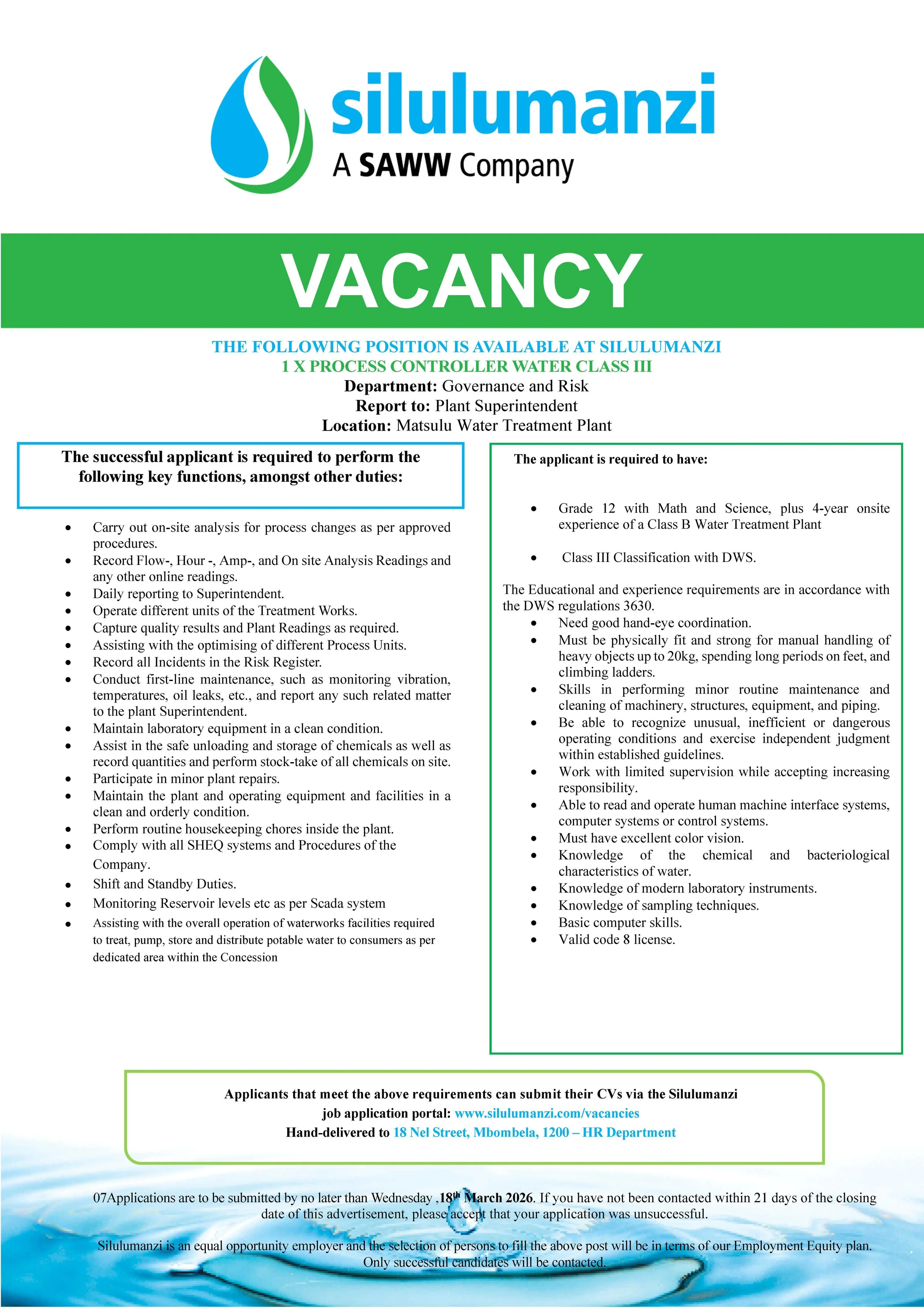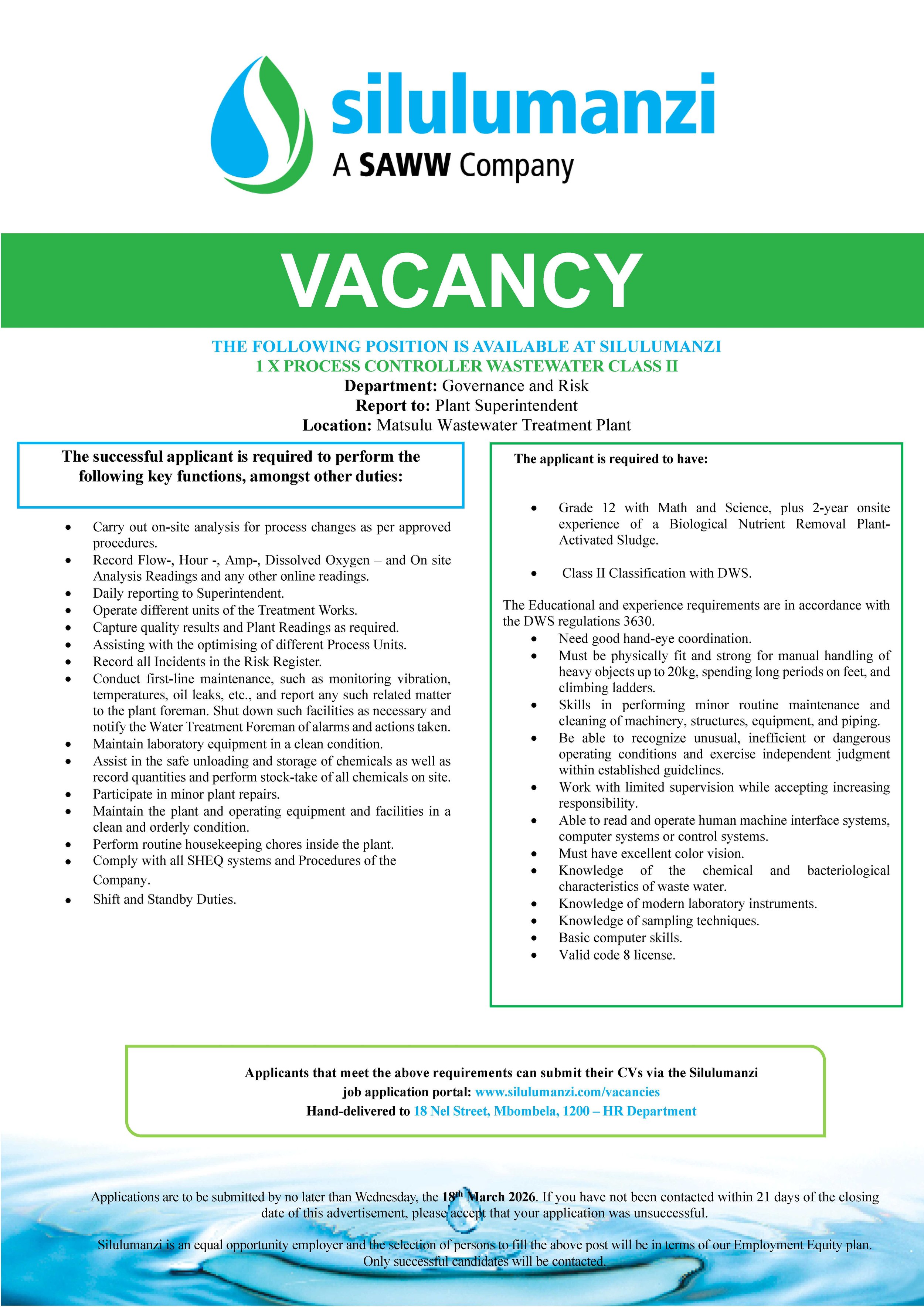 Experience in Water and Wastewater Treatment Plants and Pumpstations will be an added advantage.