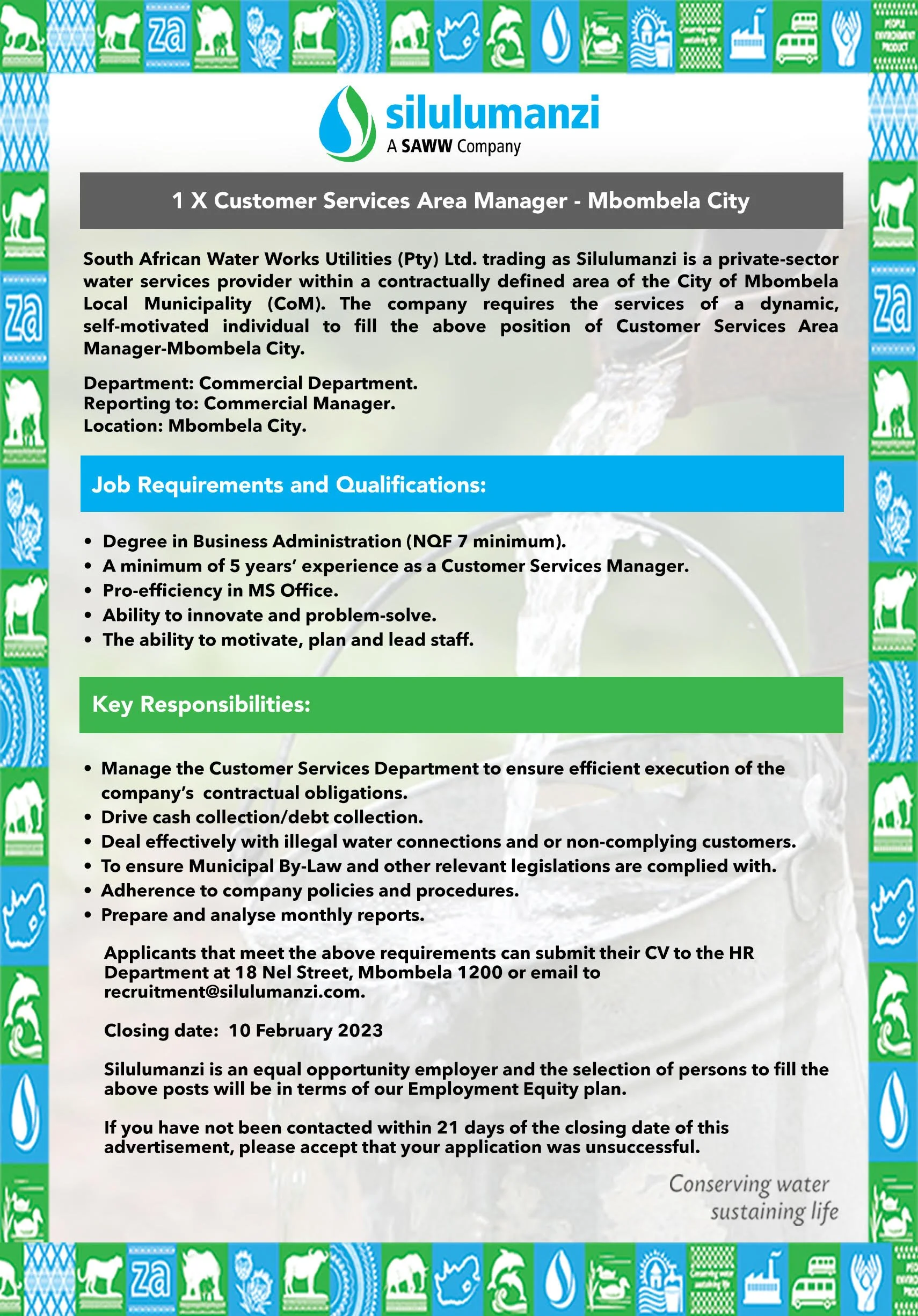 At least 10 years experience in the water and sanitation industry, of which 5 years must be at senior management level.
